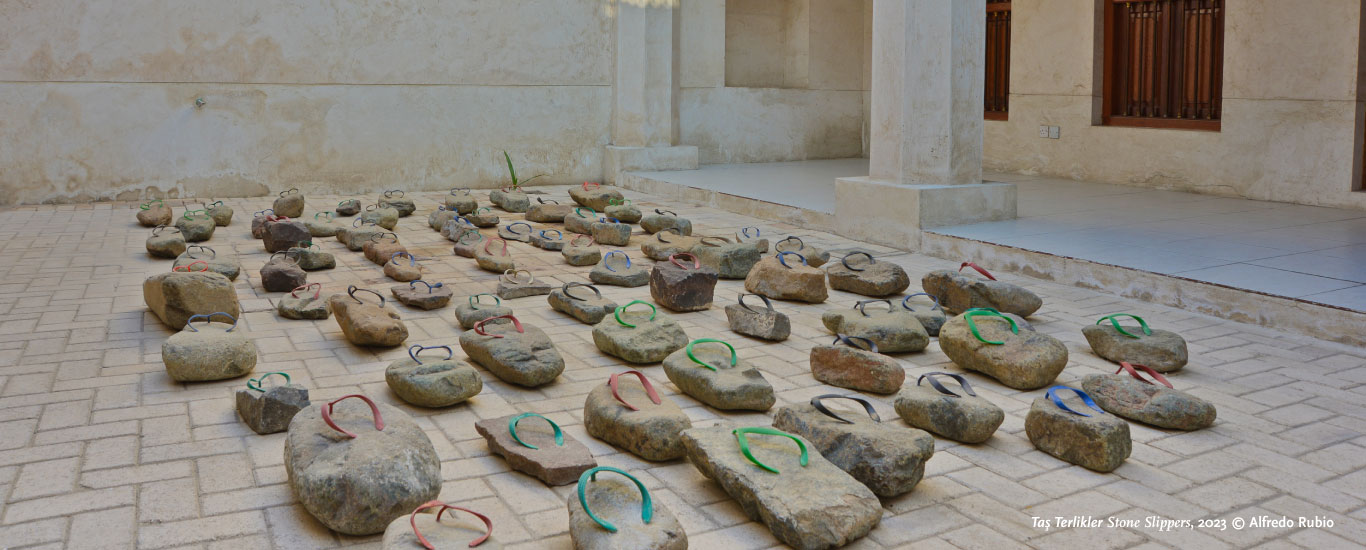Stone Slippers (2013) draws inspiration from a quotidian artefact of daily use within the Gulf: the traditional sandal. Departing from a local anecdote in which small island communities historically reclaimed land by throwing worn slippers or sandals into the sea and hoping that sand would gather around them to constitute an island, Al Saadi’s worktakes on this daily object and recasts it in stone.