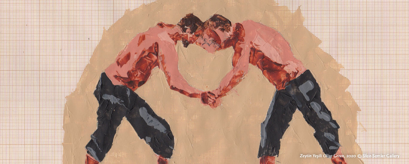 Here, Zaatari is interested in the semiotics of touch evident in performances of masculinity and rituals of homosocial culture, as well as in the dynamic between confinement and intimacy that they evince. Painted while the artist was quarantining in Beirut during the COVID-19 pandemic, both series betray a palpable seclusion that stands in contrast to wrestling’s traditional staging in crowded public arenas.