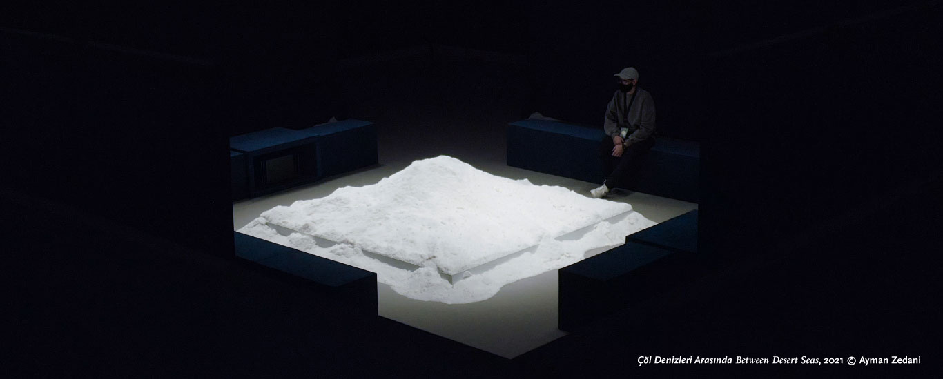 Through its narrative, the installation establishes parallels between the journey of the prophet Yunus (Jonah) who was swallowed by a whale and the routes of the Arabian Sea humpback whales. The work’s sculptural component, meanwhile, hinges on the materiality of white salt. To source it, Zedani travelled to Lake Tuz and the salt quarries of Nevşehir, collaborating with local salt mines for research and production. In the context of this work, salt is an allusion to hypersalinity, a pressing ecological issue in the Arabian Sea. The salt is shaped into ‘grief objects’ reminiscent of tombstones found in sites across the peninsula. Merging spiritual and ecological concerns, Zedani’s work reflects on environmental collapse, matrilineal transmission of culture and the impact of desalination technologies on marine ecosystems.