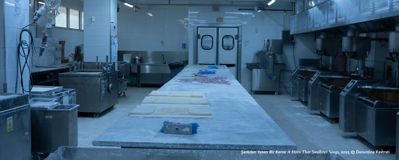 A Horn That Swallows Songs (2025) investigates the residual cost of invisible labour – particularly that performed by women – in Istanbul’s Turkish Delight (lokum) factories. The installation unfolds across two rooms, generating an immersive environment that echoes the conditions of the factory floor: endless shifts, repetitive rhythms and prolonged standing. Meanwhile, low-frequency vibrations emanating from ultrasonic speakers, floor transducers and sub-woofers travel through the floor into viewers’ bodies, transmitting a visceral bodily sensation.