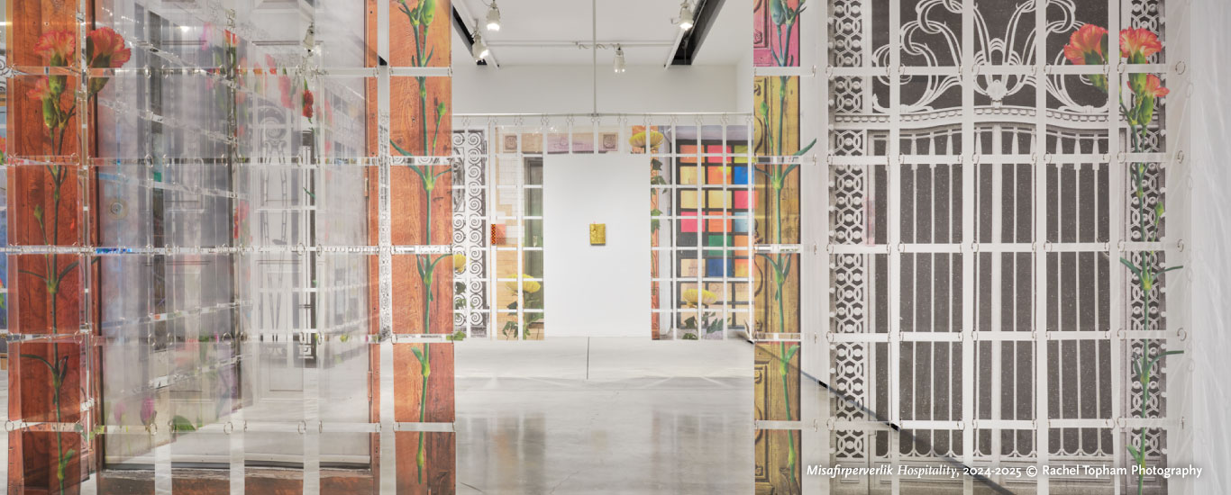 Hospitality (2024–2025) uses a deceptively modest material: laminated plastic sheets suspended together with metal binder rings. These curtain-like works hang in layered sequences, playing with transparency, surface and image. Here, interior space is both an invitation and a site of denial, a place for welcoming as well as for excluding.