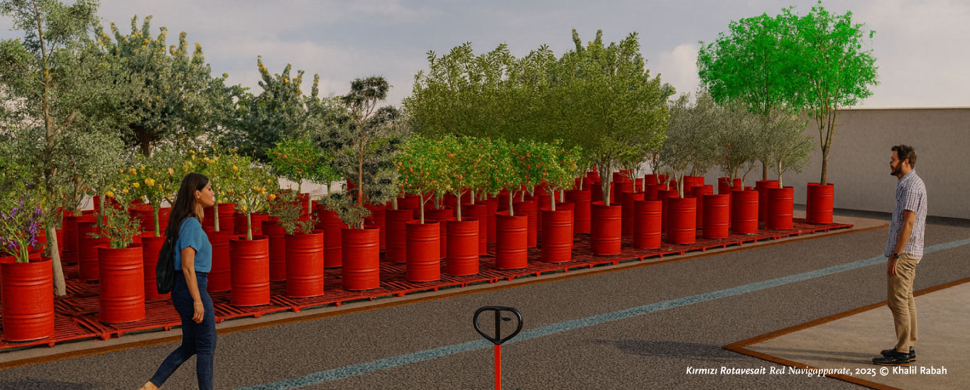 A narrow water channel cuts across the site, traversed by a rigid red metal pipe that both connects and divides. It recalls a water source that once flowed through the garden, while evoking infrastructures of extraction and control: pipelines, borders and the strained flows of water under climate and geopolitical pressures. On one bank, a red manual transpalette is mounted on a green marble pedestal – embodying the paradox of movement under constraint. Opposite, a gridded field of more than 100 red barrels, each placed on red wooden pallets and cradling a mature olive, citrus, or nut tree, forms a provisional nursery. Shaped by the legacy of the former French Orphanage, Red Navigapparate does not merely guide movement – it entangles the viewer in the history of the site.