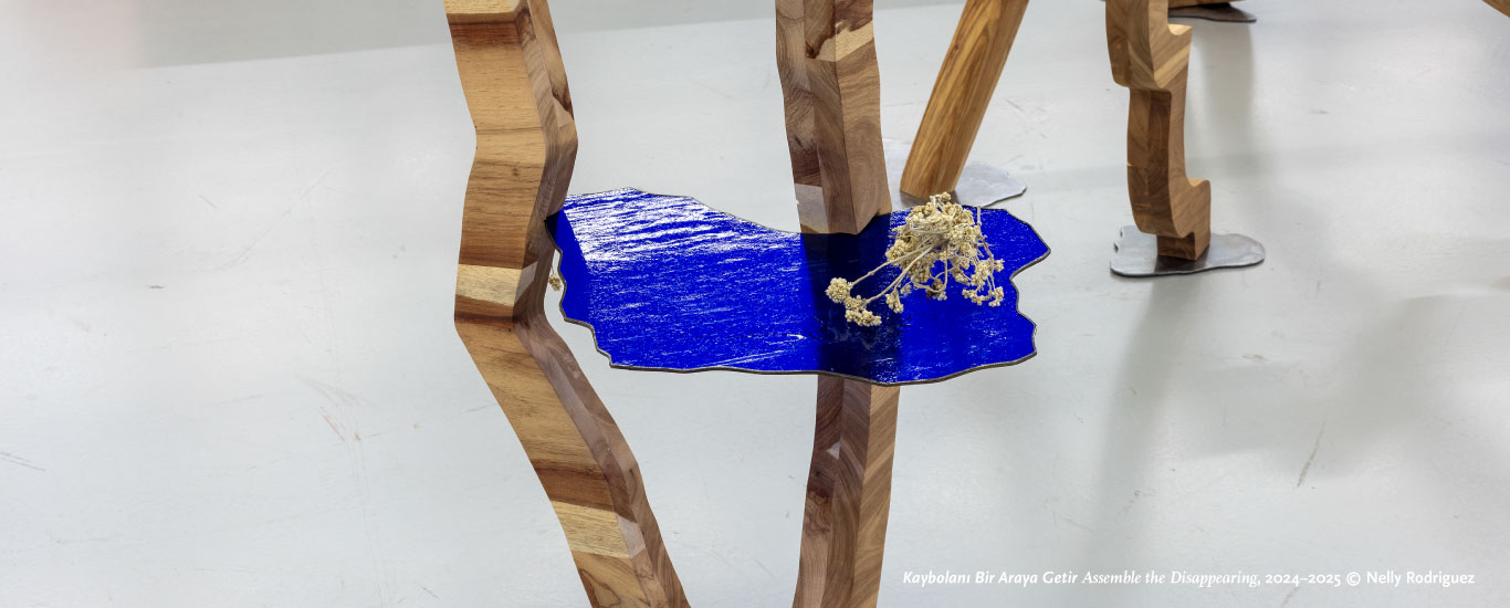 Assemble the Disappearing (2024–2025) greets viewers through a maze-like, post-organic terrain whose twists and breaks suggest discontinuity and collapse. Composed of wood, stained glass, mpepho, and Gqunta’s signature razor wire, the work draws inspiration from radical anti-colonial thinker Amílcar Cabral, an agronomist, engineer and political leader who championed pan-African liberation by emphasising a return to the land. For Cabral, land was not just territory: it was an active agent in the revolutionary process, a living ground for resistance and regeneration.
