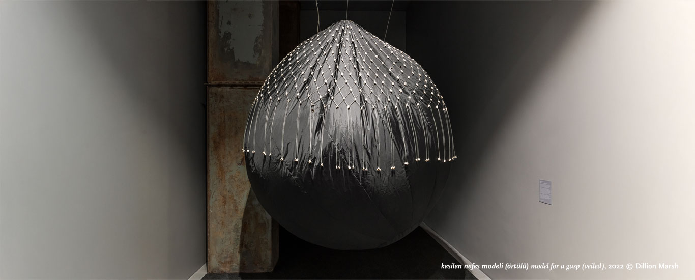 model for a gasp (veiled) (2022) is a kinetic, sculptural work that inflates and deflates a globular form veiled under cowry shells according to the rhythm of the people in the room, turning the presence of bodies into a particular kind of geo-biofeedback. Suspended from the ceiling, model for a shadow (articulated) (2025), on the other hand, takes on the form of the globe and reconfigures it through a recurring mirror image, gesturing towards an alternate existence.