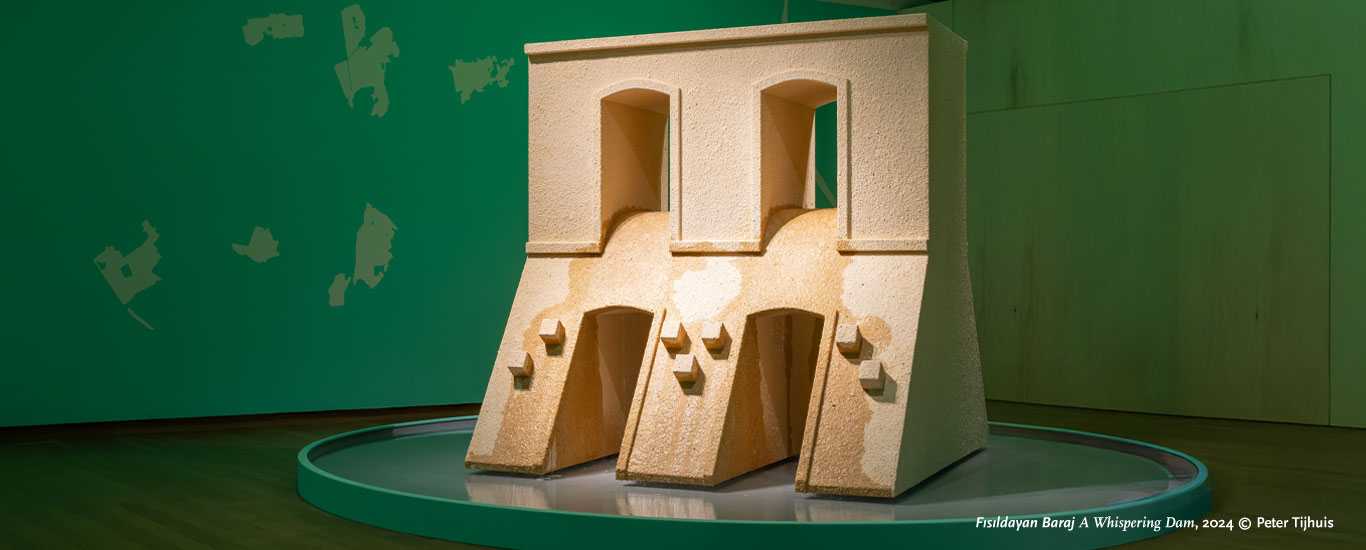 At the centre of A Whispering Dam (2024) is a 2.2-metre-high sculptural form evoking the modernist infrastructure of the Sennar Dam that channels the Blue Nile into Gezira. A sound piece embedded within it plays a whispered ruqya (ُ رُُقُُیة ), a protective incantation that acts as both sonic cleansing and resistance against the forces of nature. Framed photographs show her grandmother’s house atop unstable clay soil, its cracked walls and dried earth forming material records of collapse. The installation presents an ecology in which water, clay, light and memory resist colonial time and linear progress, favouring seepage, ritual and suspension as forms of knowledge and witnessing.