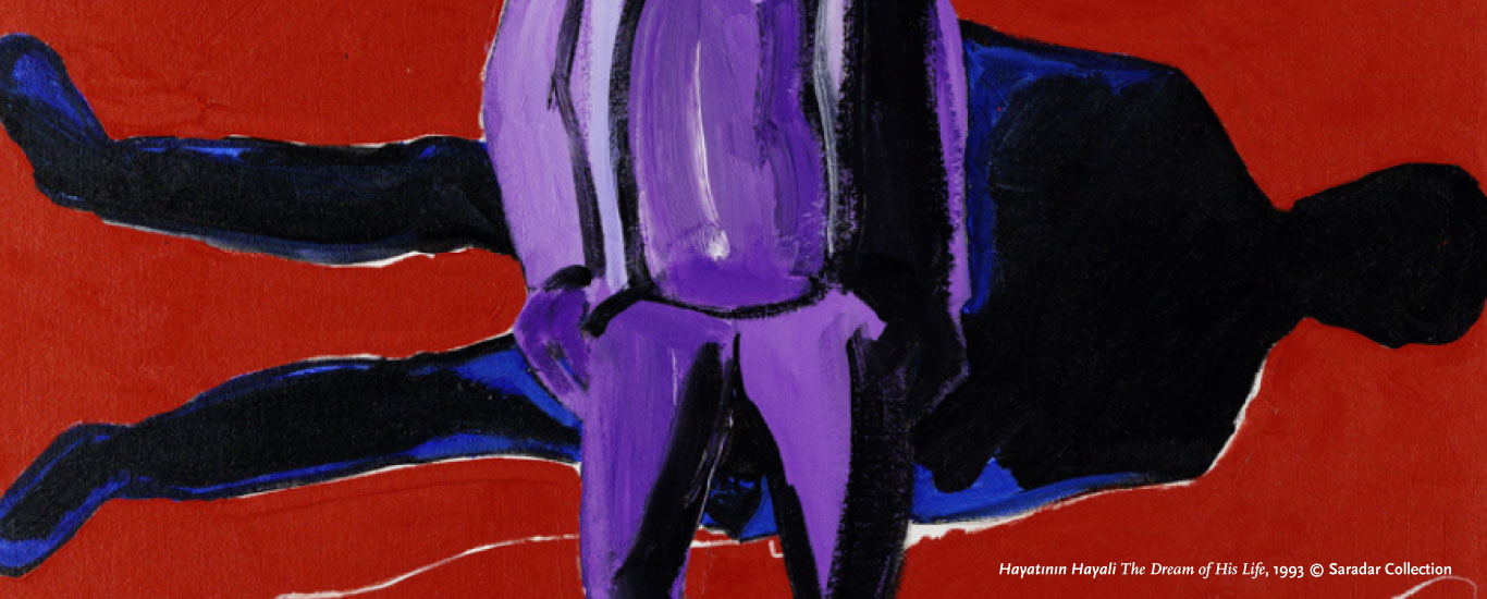 Upon emigrating to Los Angeles, Manoukian began her T-Shaped series – two works from which A Man of Culture and The Dream of His Life, both dated 1993, are also presented at the biennial. These works feature a more restrained, introspective palette and reflect on the psychic aftermath of conflict: a state of suspension amidst collective yearning for stability.