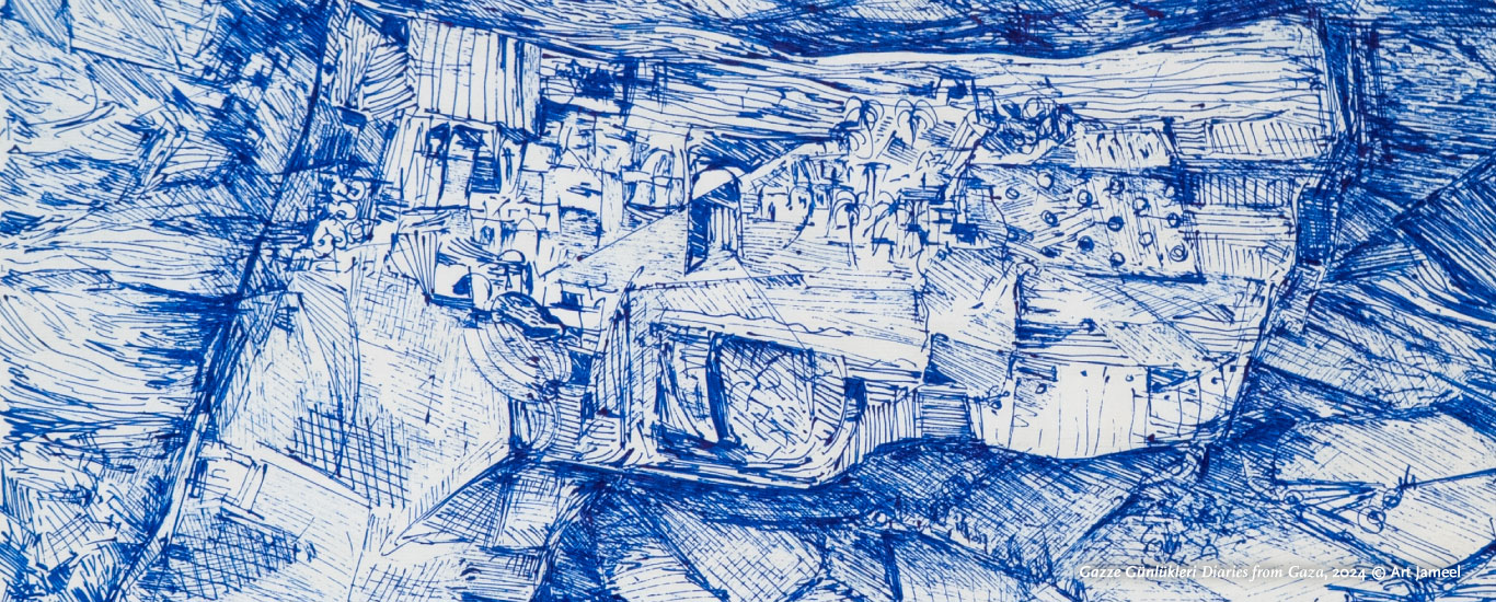 Diaries from Gaza is a series of notebook drawings in ink, rendered in raw, gestural strokes tracing Salem’s daily life under siege. At the biennial, twenty of these works on paper are exhibited, accompanied by scanned copies of the original notebooks displayed on a table. Some of these drawings were smuggled out of Gaza during the genocide – a logistical and emotional feat in itself. More than artworks, these pages are a testimony: a visual archive of that which remains unspeakable in the language of news and media. They are a message from the heart of Gaza, a window onto the truth of life in the Strip.