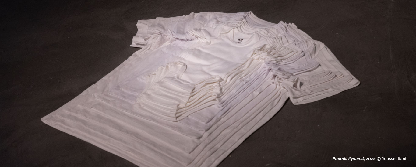 Stéphanie Saadé’s Pyramid (2022) series is composed of everyday clothing items, such as socks, T-shirts and leggings layered and sewn into one another in an incremental fashion, from the smallest infant size to largest adult sizes. Forming a gently sloping, vertical silhouette, the works resemble a stratified monument of growth and care, testifying to the evolution of intimate matter as well as its relationship to the body. The resulting structure is both familiar and uncanny: a cartography of life stages that materialises time as both visible and tactile.