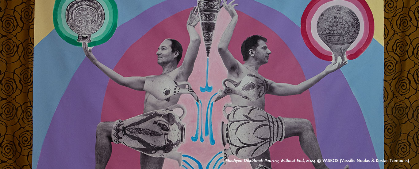 With Pouring Without End and Spilled in Good Faith, VASKOS revisits the iconography of ‘Greekness’, an idea sustained by the Greek state and tourism industry in attempts to monetise history. Within the vividly coloured visual realm of the textile panels, the duo take up the symbol of the jug or amphora, which has long been a shorthand symbol for Hellenic identity in the historicisation of Greek civilisation and mythology. Here, depictions of the artists themselves are interwoven with motifs from classical antiquity and other ornamental icons.